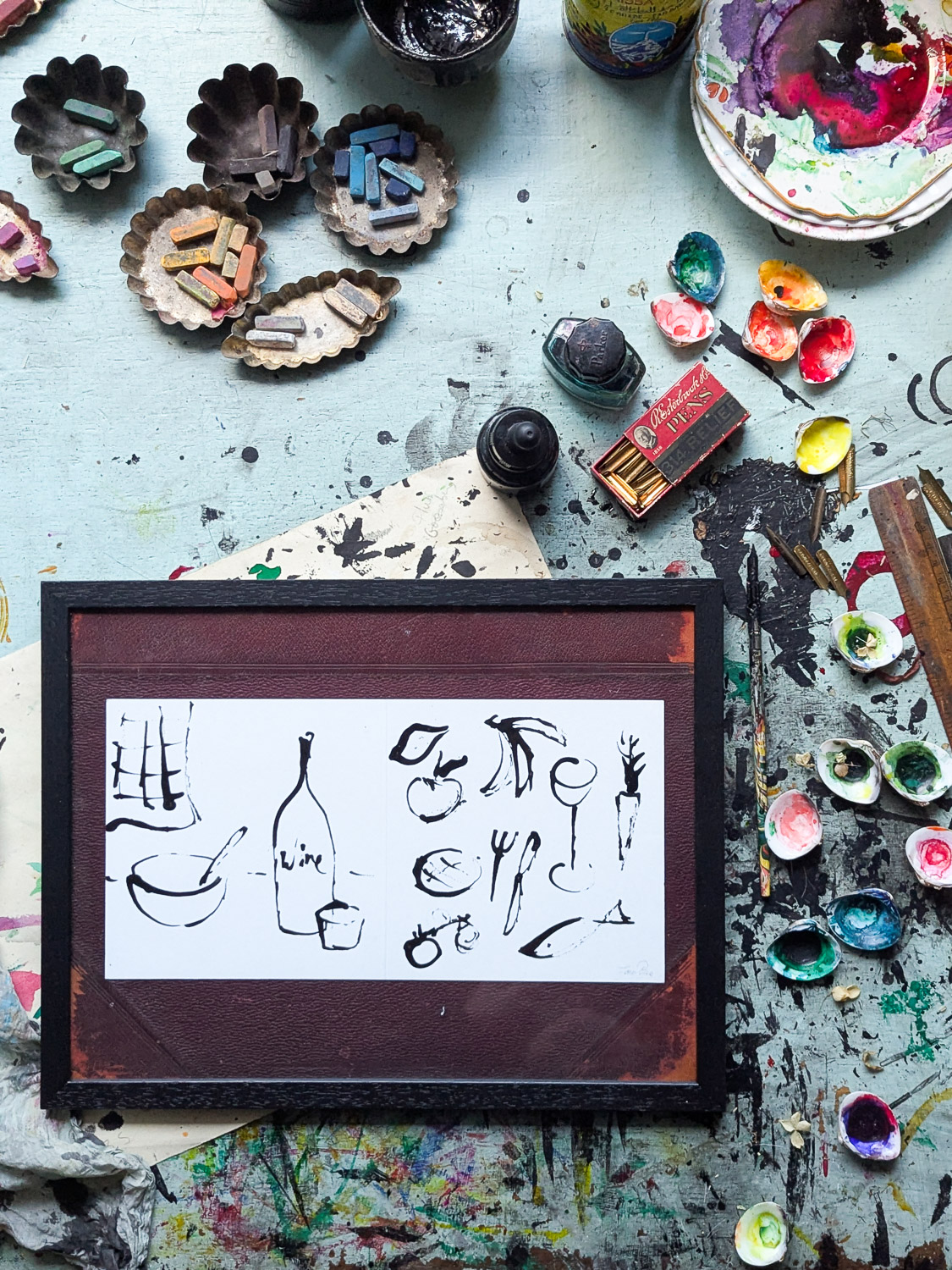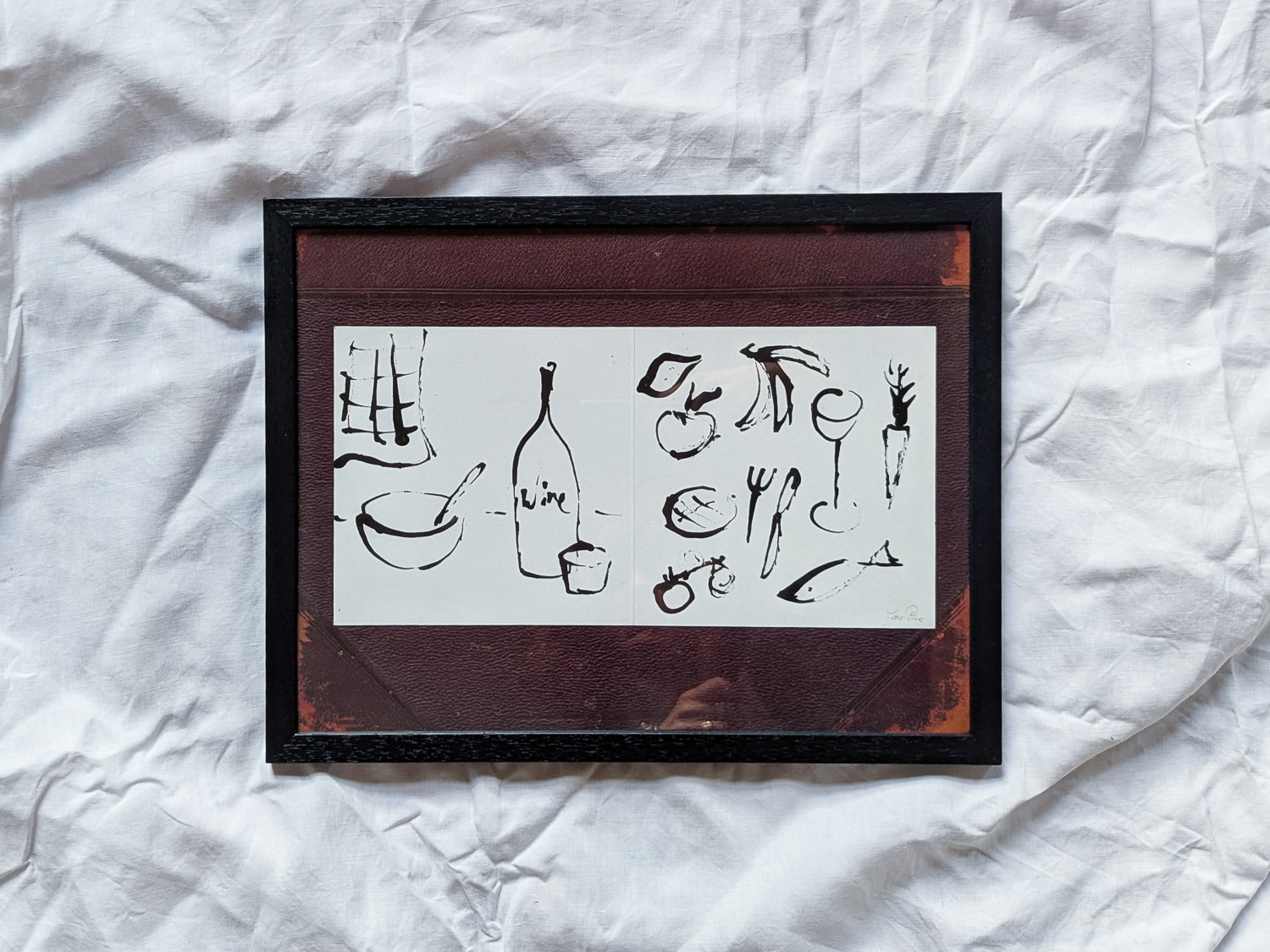 Lunch – Original Signed Ink Drawing mounted on vintage book cover and framed, by Java Bere