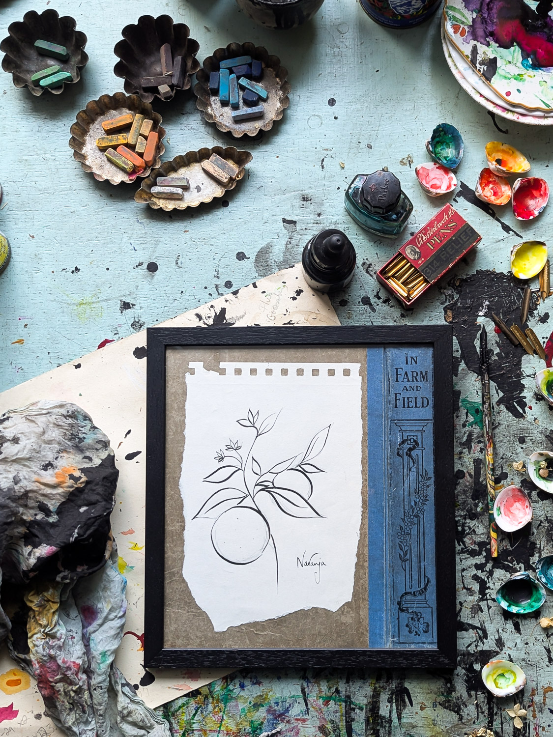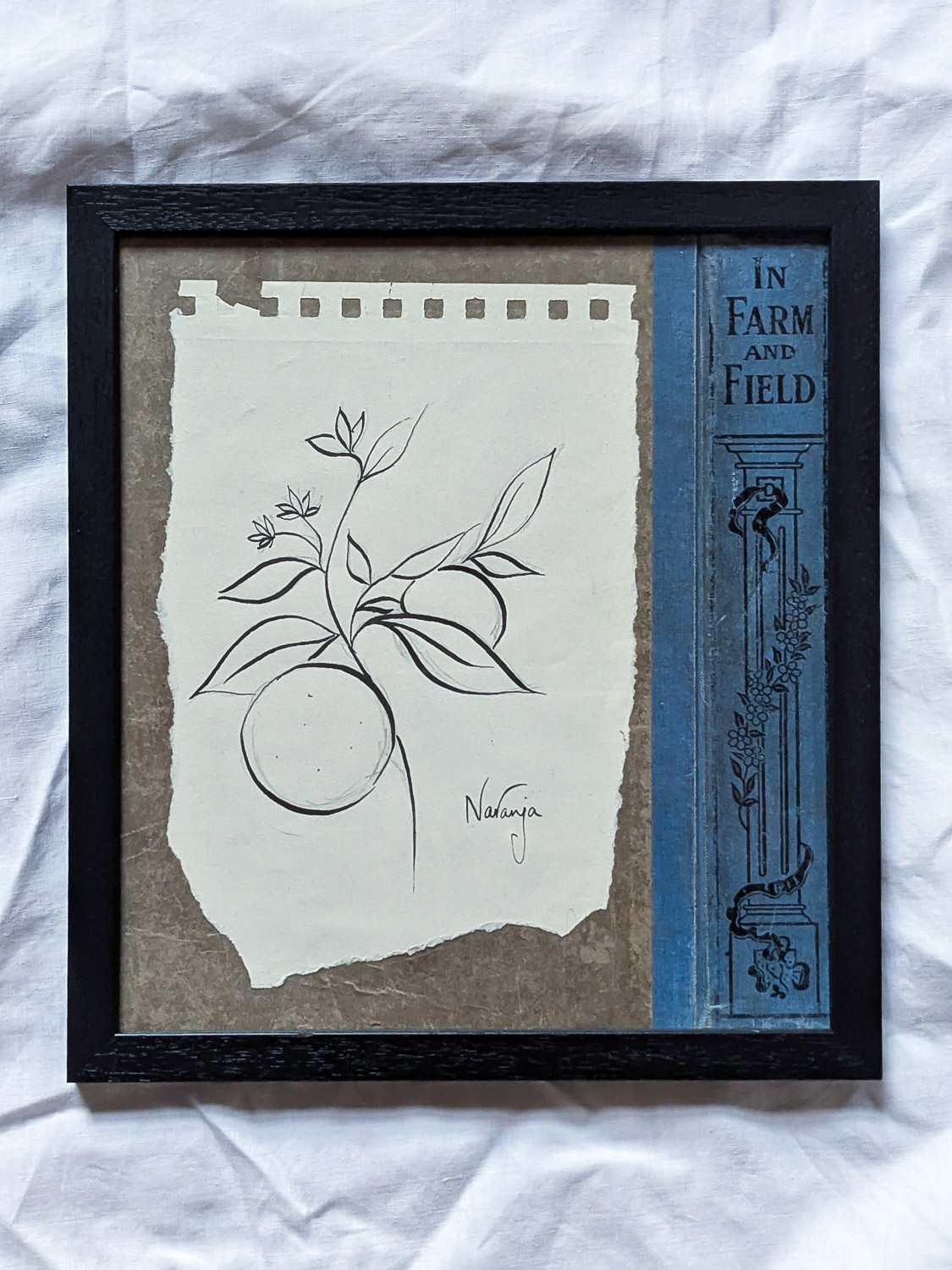 Naranja – Original Signed Ink Drawing mounted on vintage book cover and framed, by Java Bere