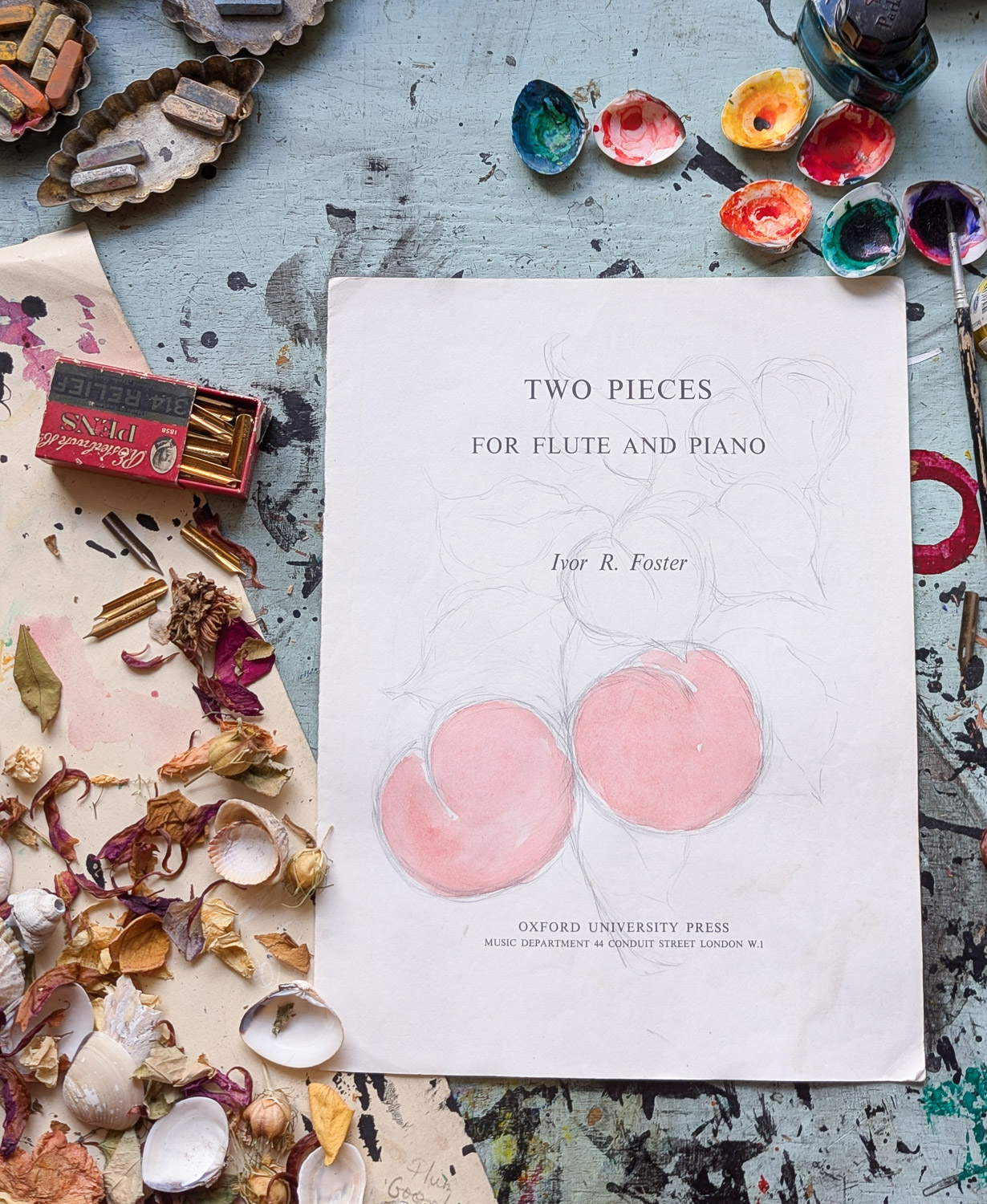 Inspired by the soft juicy peaches we ate this summer in the South of France. These fruits are drawn onto the page of a vintage music book.