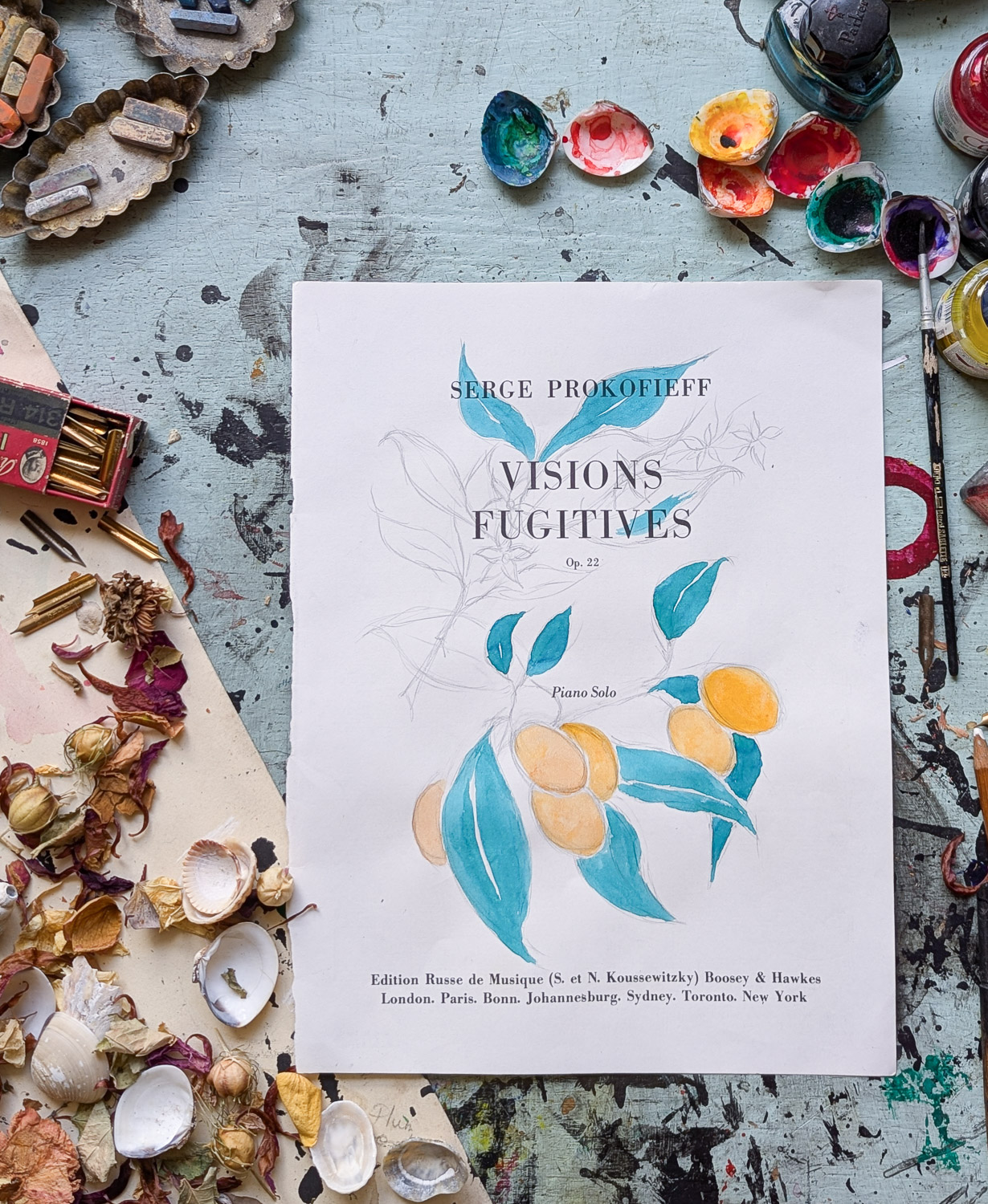 Inspired by my love of citrus fruits and the fact that I always buy the kumquats when they occasionally pop up in the local fruit and veg shop. These fruits are drawn onto the page of a vintage music book.